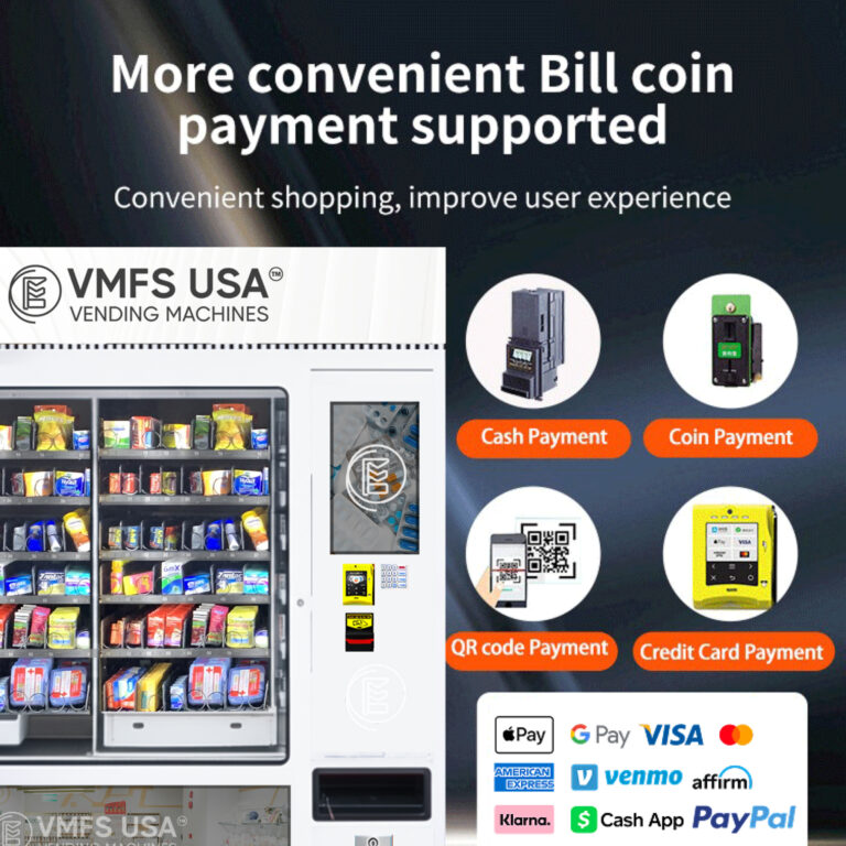 Supports cash, coin, and mobile payments, including Apple Pay and Google Pay. Our vending machines with card reader ensures easy transactions.