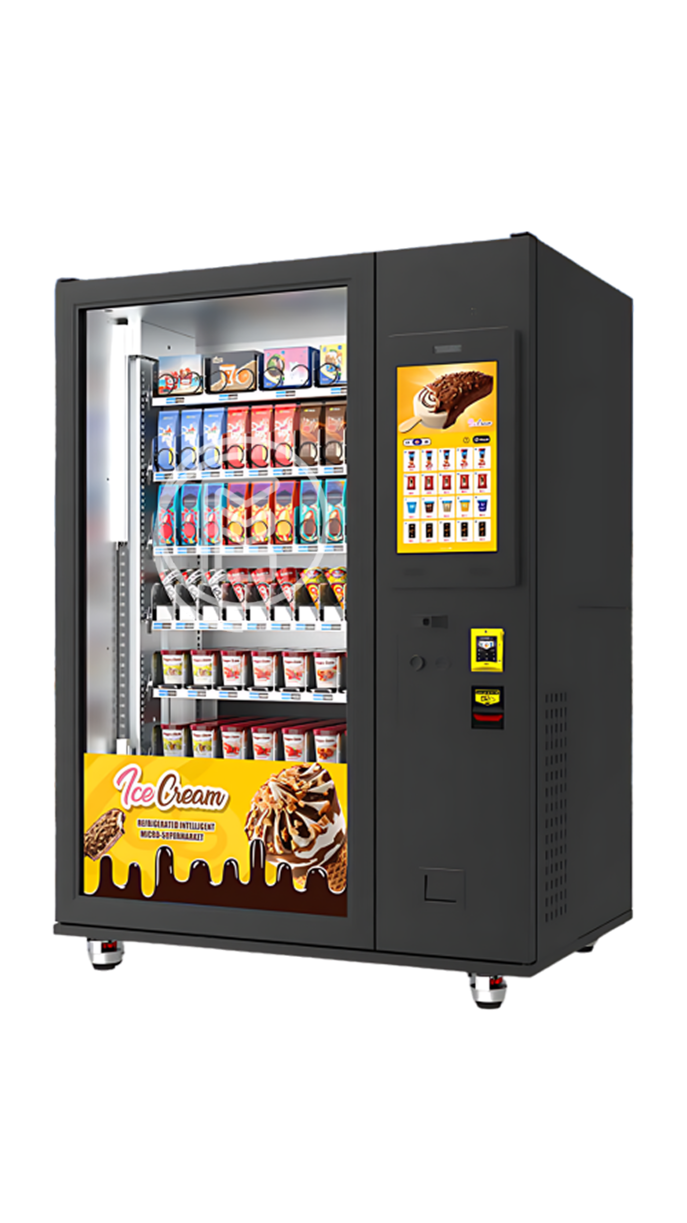 Introducing the Big Freezer Vending Machine, ideal for selling frozen foods like ice cream and frozen pizza. With advanced refrigeration, a 22-inch touchscreen, and flexible payment options, this machine is perfect for school campuses, factories, and shopping malls.